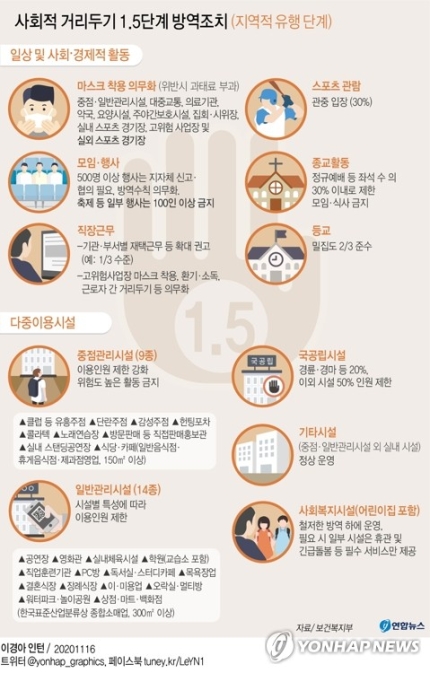 1.5단계에서는 유흥시설에서 춤추기와 테이블 간 이동이 금지되고, 방문판매 등 직접 판매홍보관은 오후 9시 이후 운영이 중단되는 등 시설 종류별 방역수칙을 철저히 준수해야 한다.